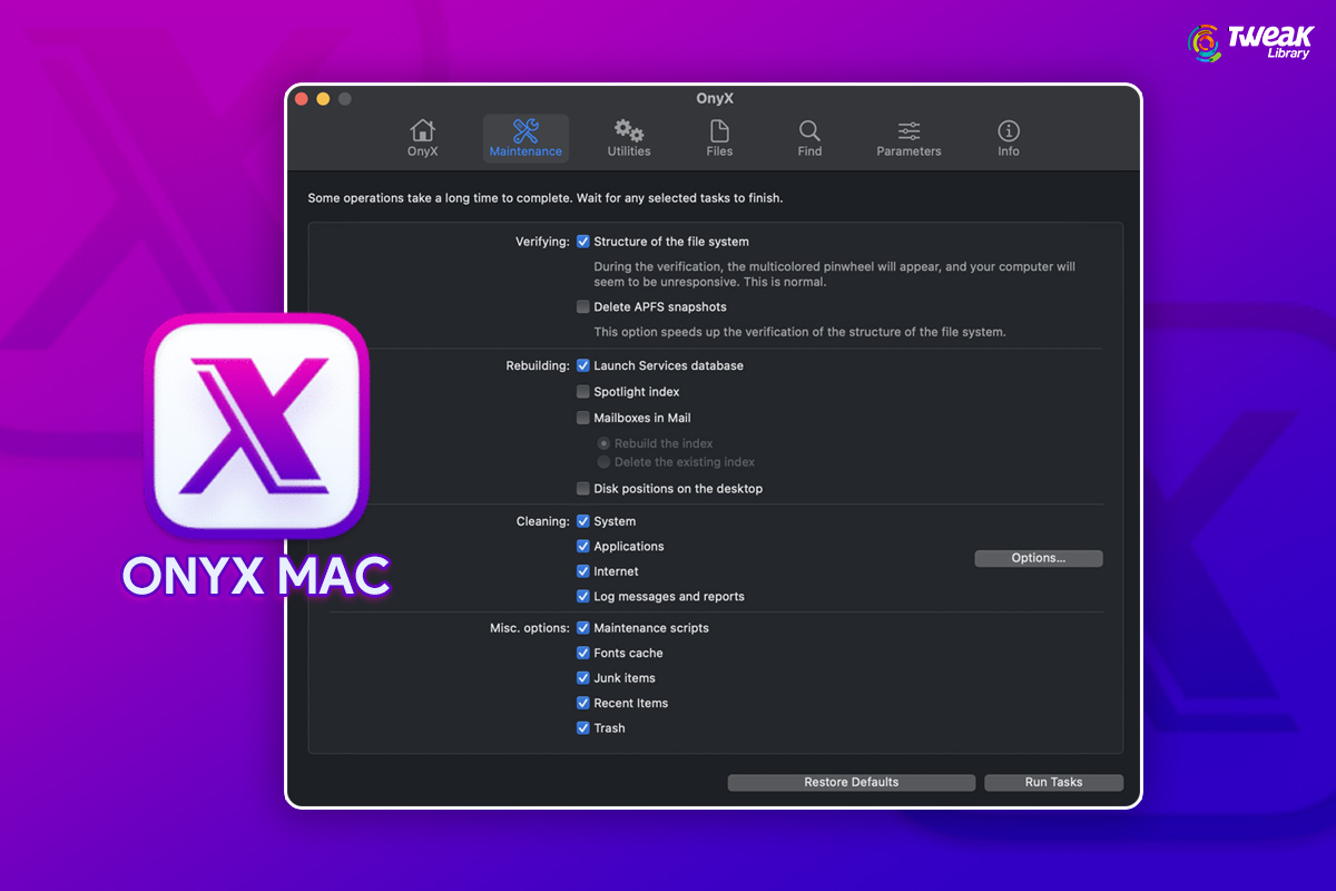 This section includes a checklist of maintenance chores that Onyx can do in a single click on your Mac. The checklist is divided into rebuilding, cleaning, and others. Each activity is intended to leave you with a Mac that works more smoothly and effectively.